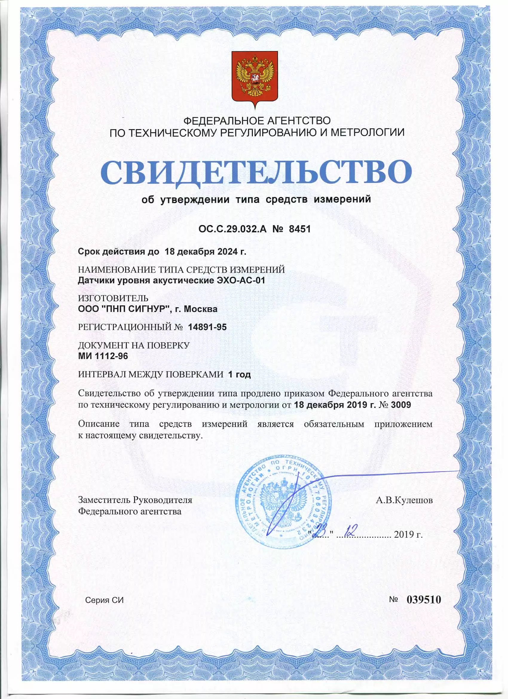 Ультразвуковой уровнемер ЭХО-АС-01 зарегистрирован в Государственном Реестре средств измерений под № 14891-95